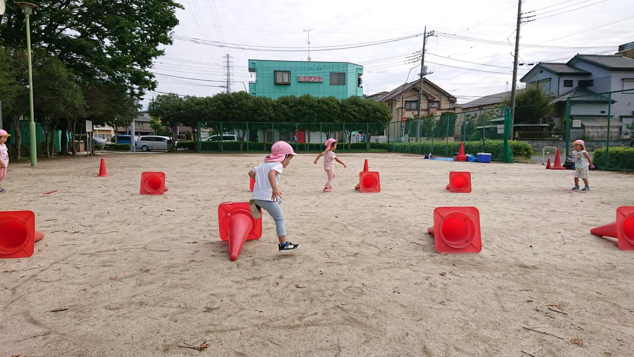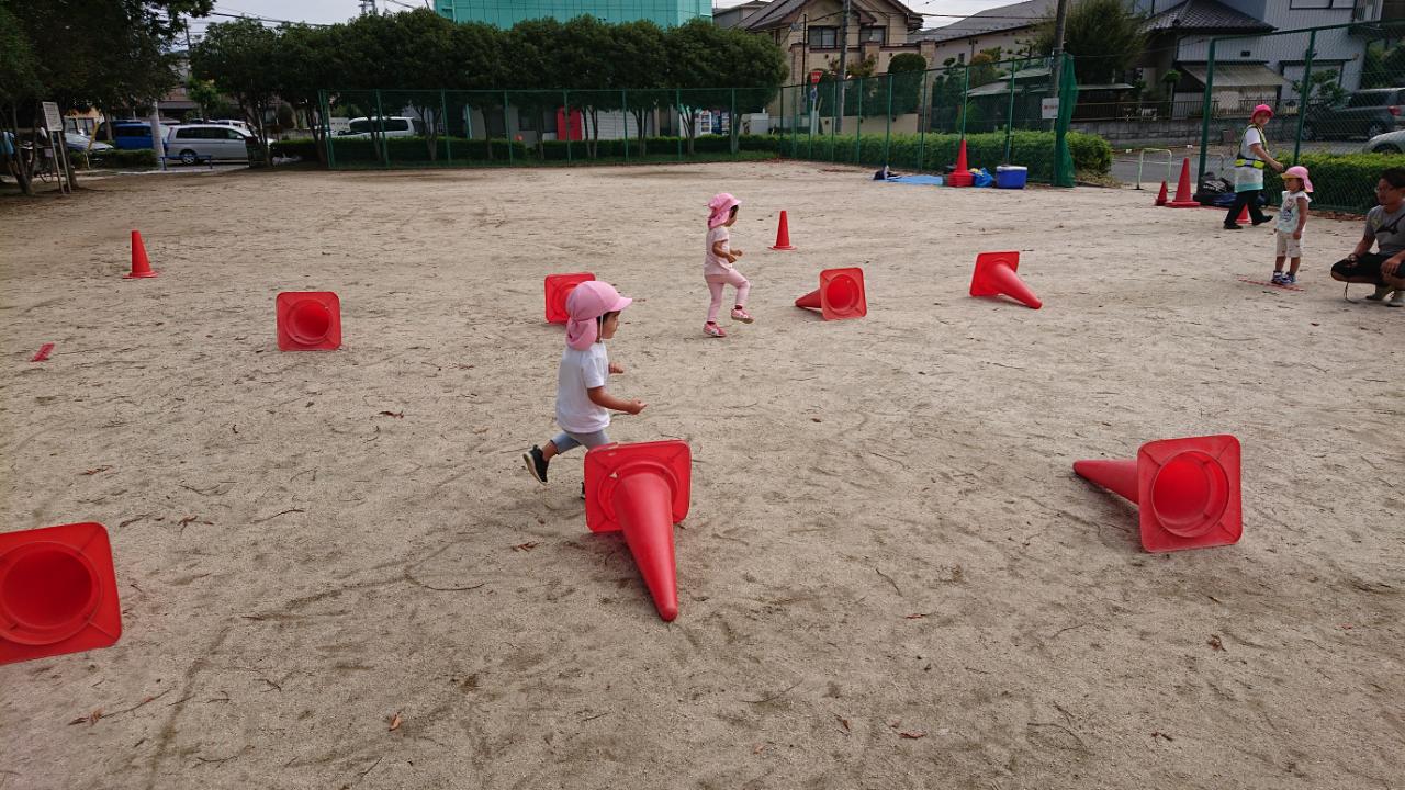 次にコーンにぶつからないようにジグザグに動いたり、倒れているコーンをジャンプしたりしました。